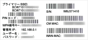 SSID・暗号化キーはモデムの側面もしくは底面に貼られたラベルシールに記載されています。