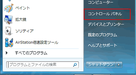 パソコンの無線LAN機能をオンにしたあと、「スタート」メニューから「コントロールパネル」を選択します。 |